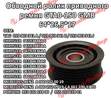 Обводной ролик прив ремня GMB для Audi A4 A5 A6 A8 Q5 Q7 BMW 3 SS Actyon 2012- Korando Rexton W II Kyron Mercedes C-Class; 64*26.5*17; GTA0150; (TG-6612003170 ) GT70380 059903341A 059903341E